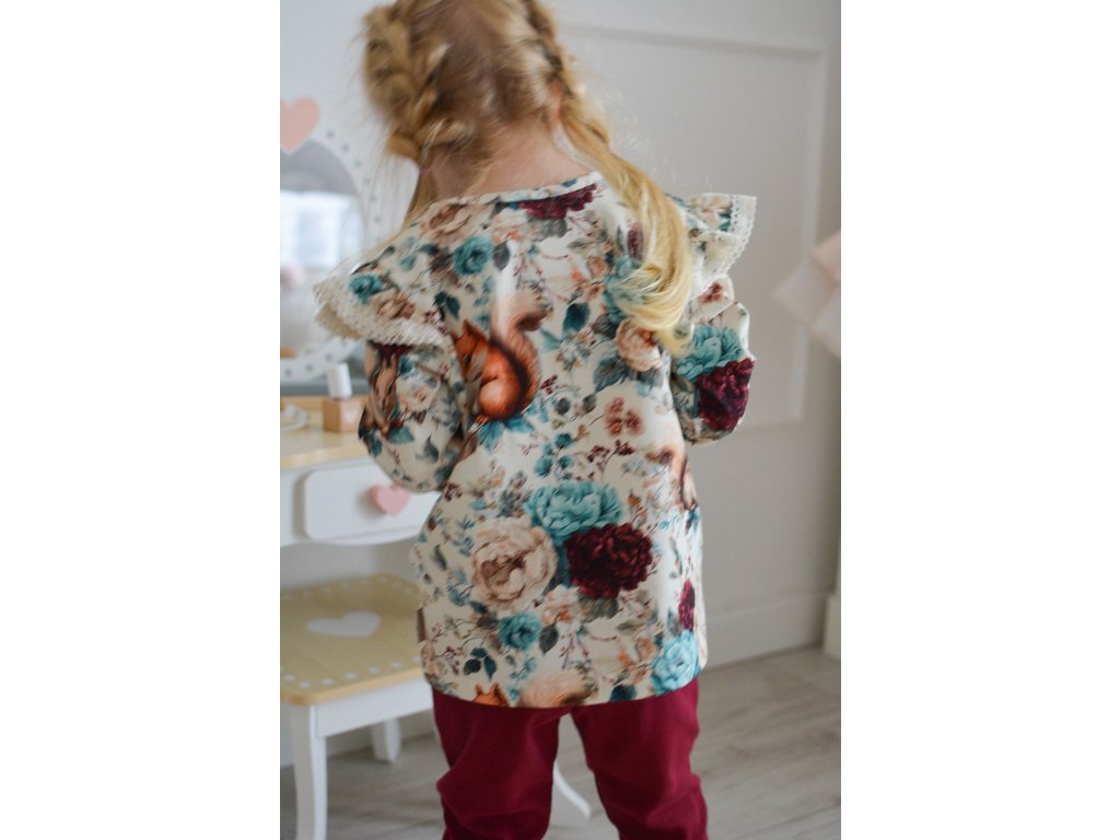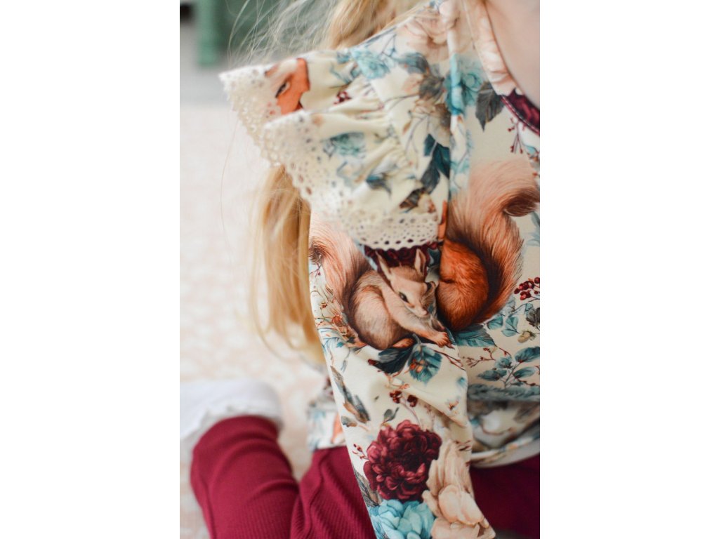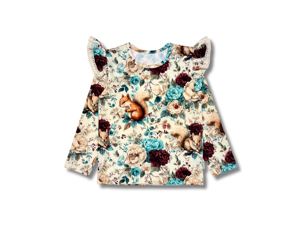 Nádherná bavlněná halenka s podzimním potiskem veverek a květin.